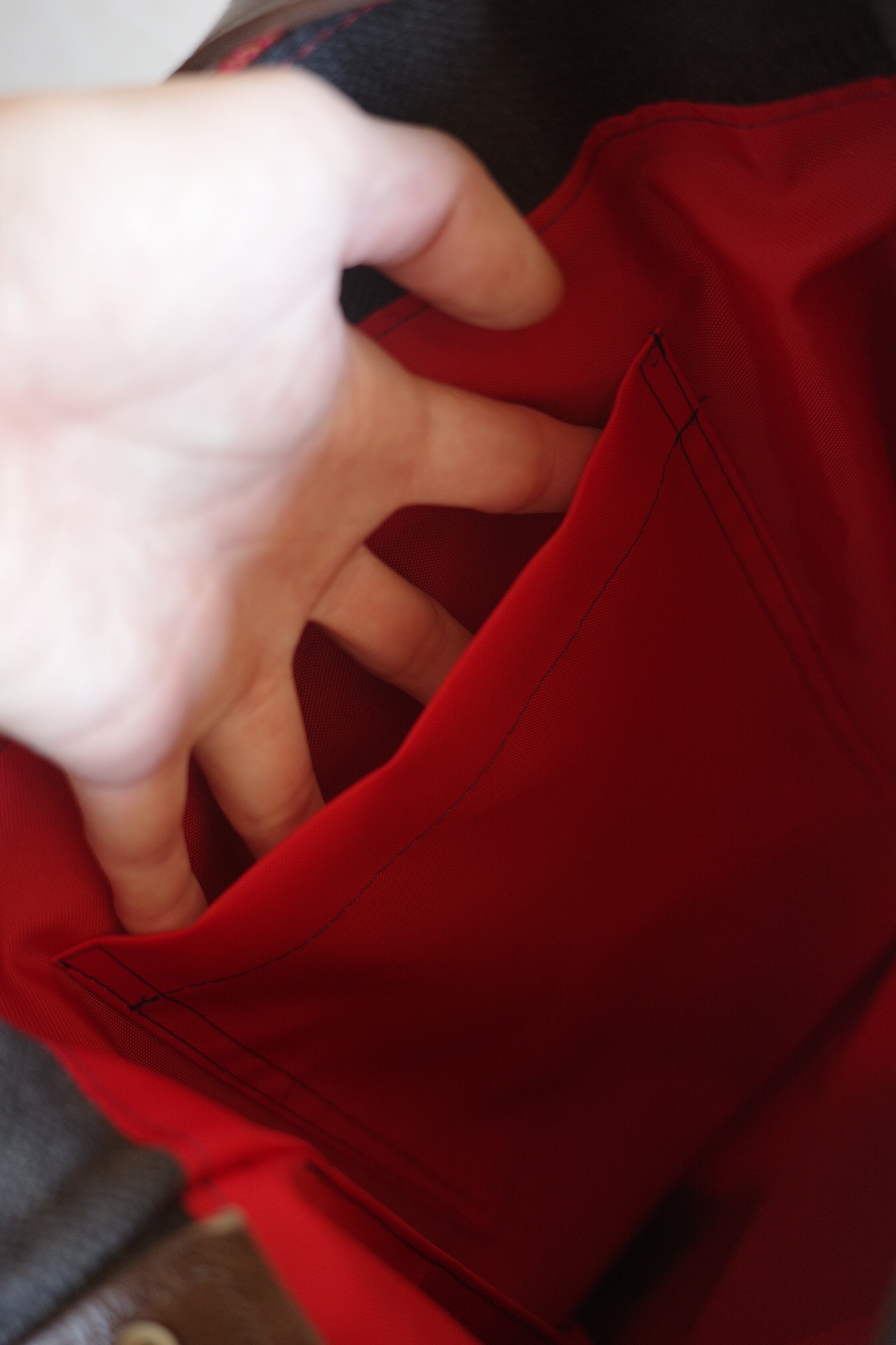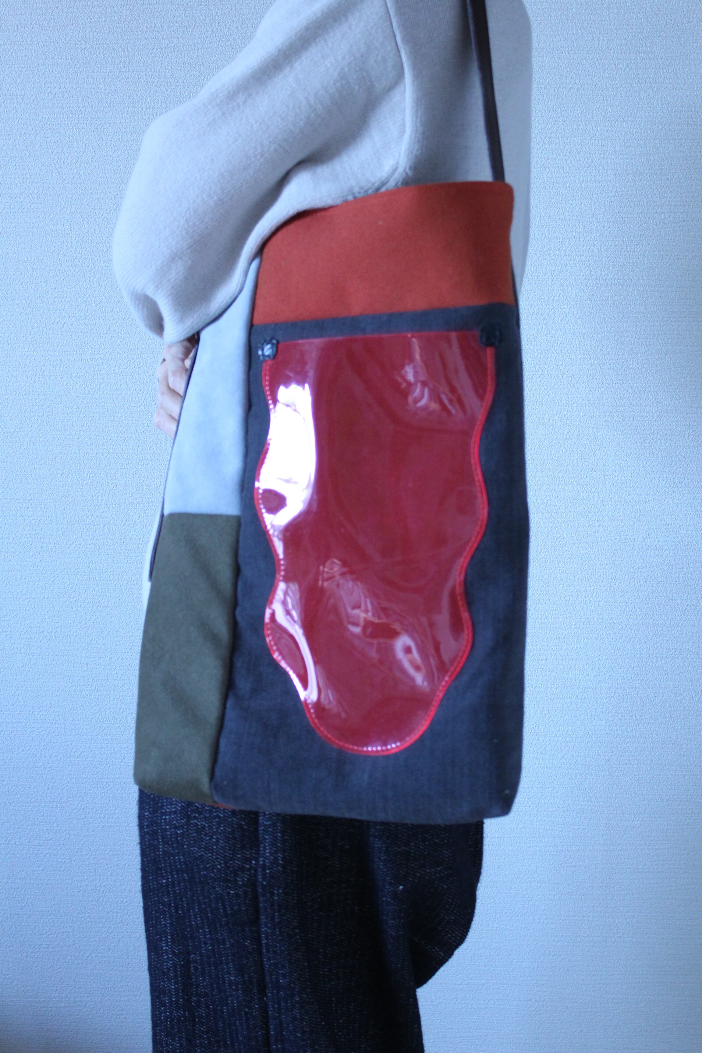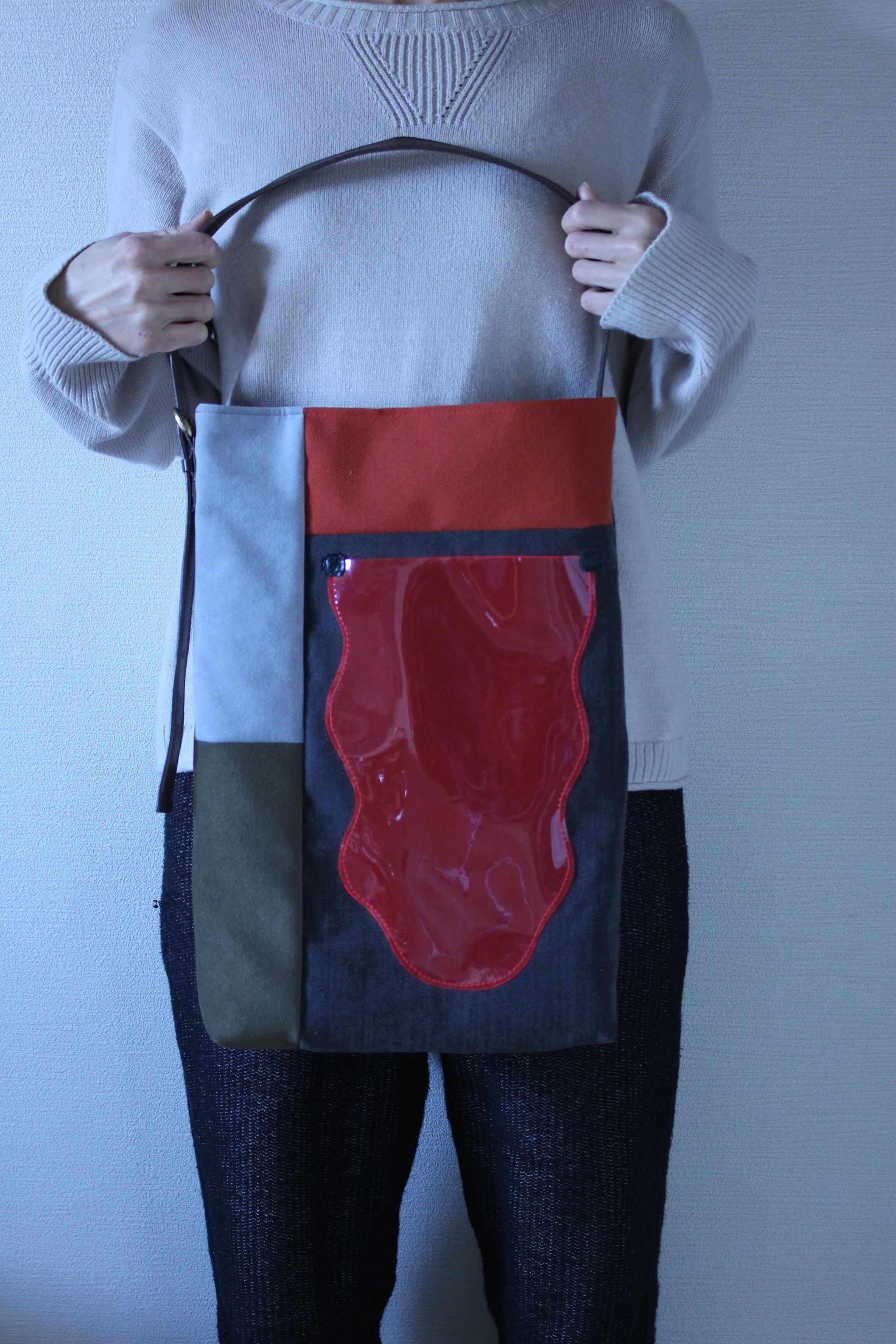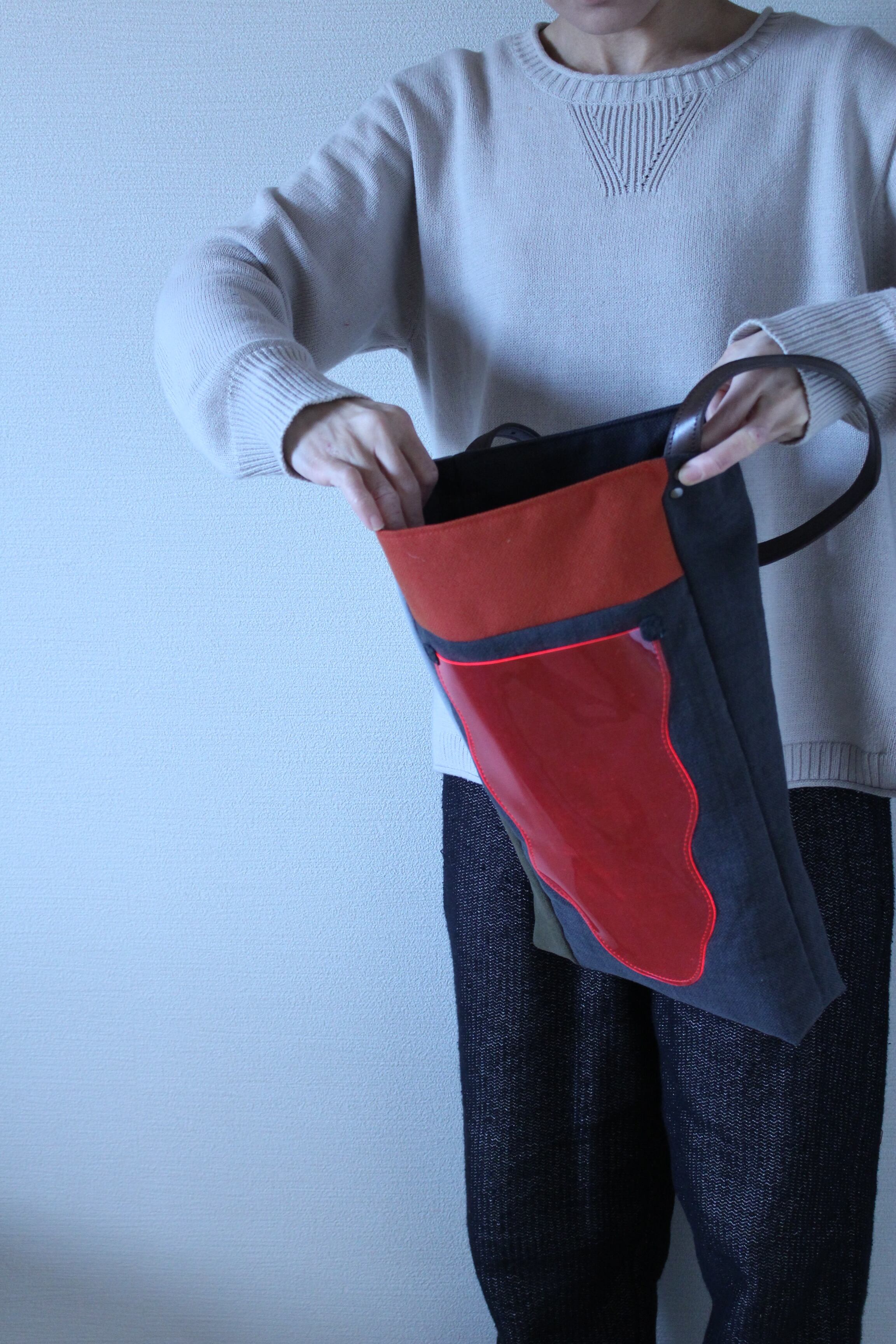 大きな赤いビニールポケットがインパクト大です。オレンジとチャコールの組み合わせがbauhausっぽい配色でお気に入りです。