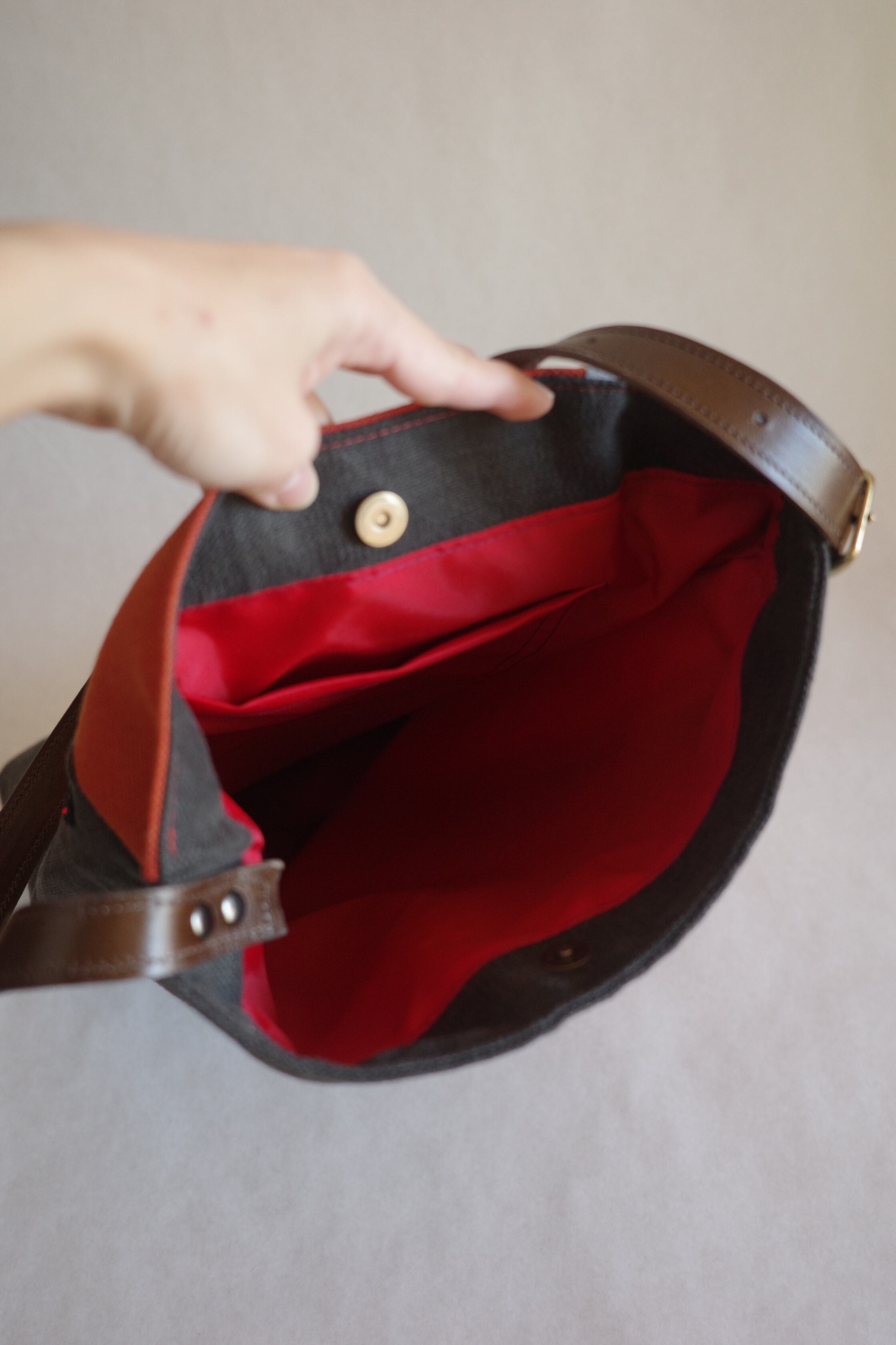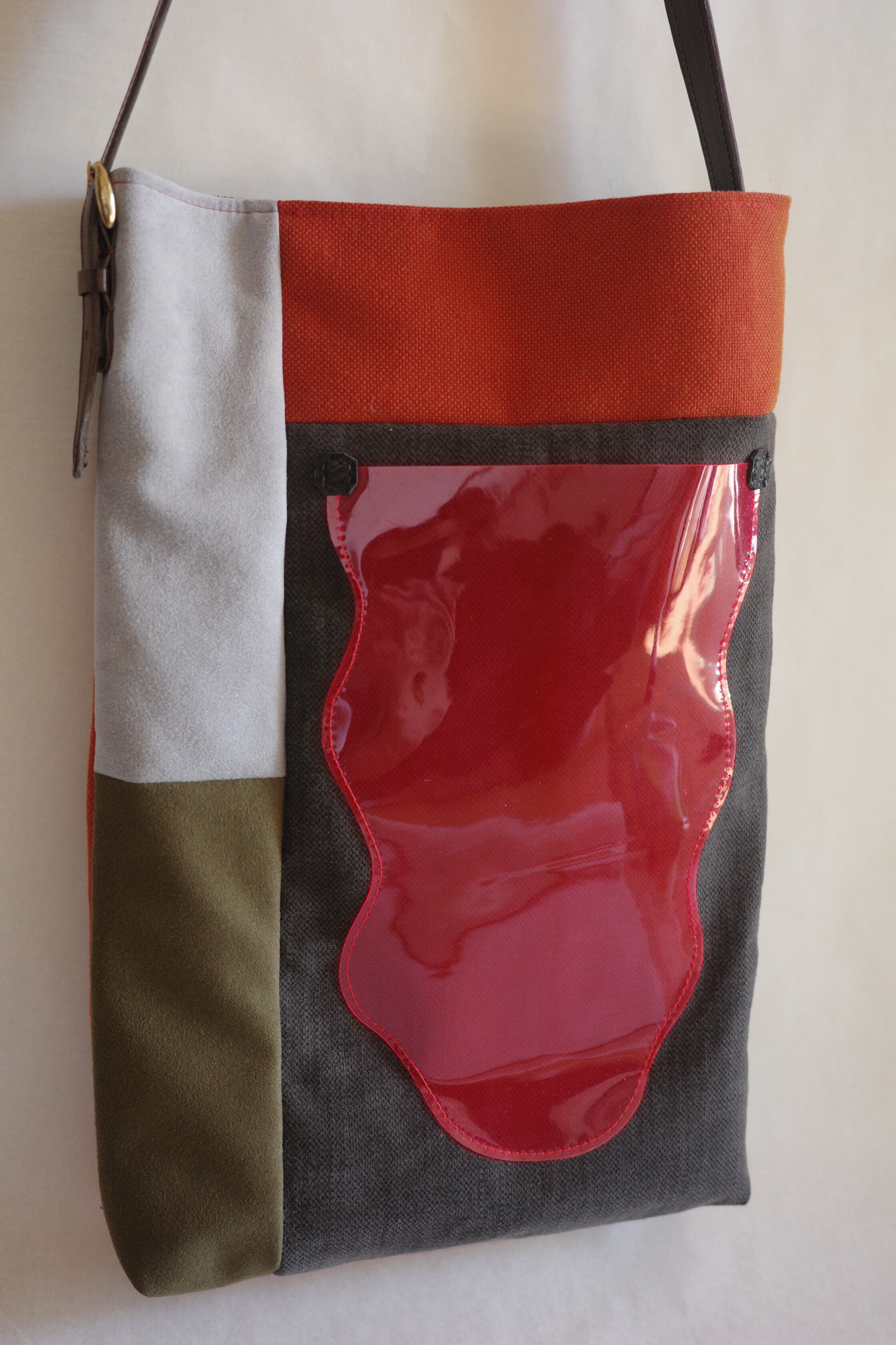 椅子張り用の生地を組み合わせたバッグに赤いビニールのポケットをつけました。