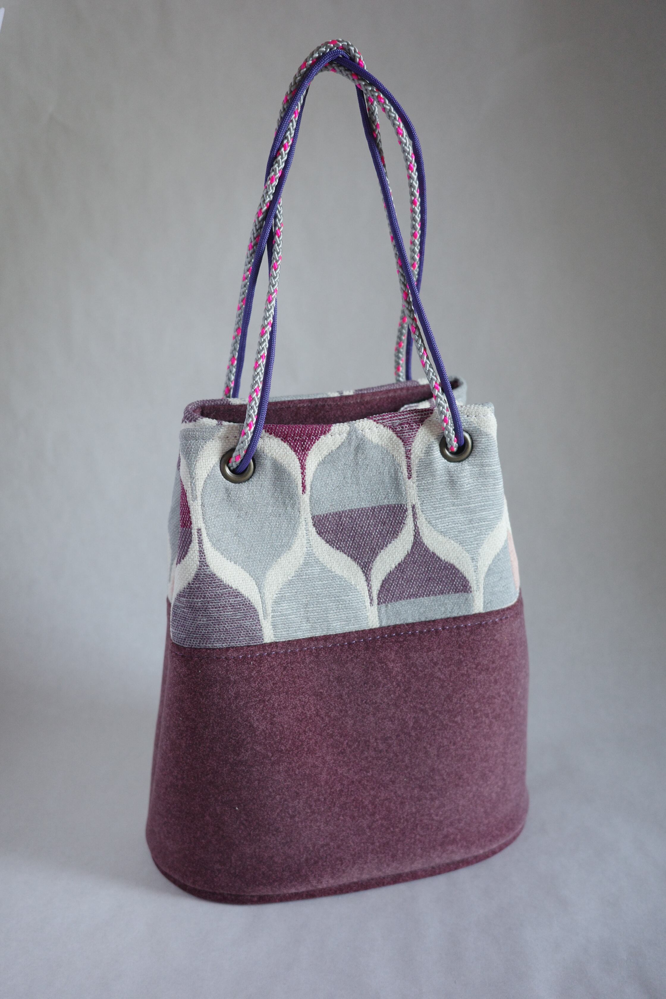 表地には“スムースな紫の生地“と“コットンリネンの優しい風合いの北欧風ファブリック“を使用しています。どちらも椅子張り用の生地なので、厚手でしっかりしてます。