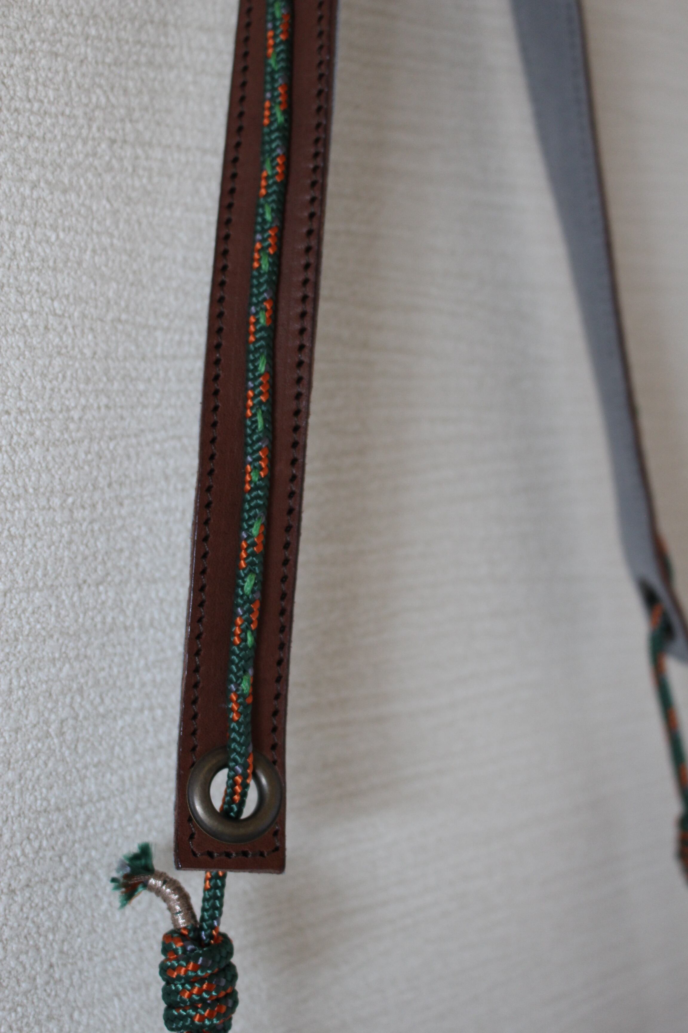 ロープだけだと肩に食い込んで地味に負担がかかるので、レザーを縫い付けて改良しました。