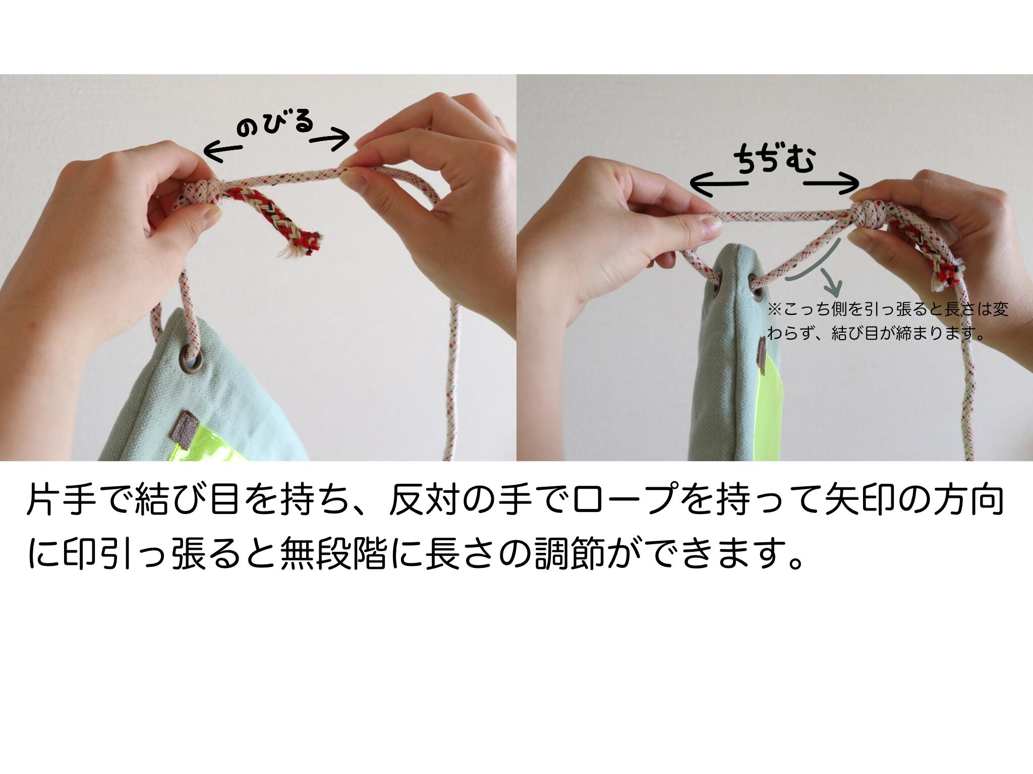 持ち手のロープは無段階で長さ調節ができる結び方になっています。(11枚目の画像をご覧ください)